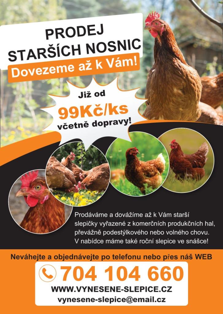 Společnost nabízí prodej a dovoz starších slepiček z komerčních produkčních hal, které jsou převážně z podestýlkového nebo volného chovu. Zájemci si mohou zakoupit slepičky přímo s možností dopravy až domů. Kromě toho jsou v nabídce také roční slepice ve snášce.